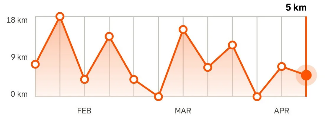 It wasn’t until I looked at my Strava graph (which tracks your total running distance per week), that I noticed I was doing exactly what I warn people not to do every single day in the clinic! I was recovering until my pain settled, and then going back too hard and too fast, which was constantly re-aggravating my injury.