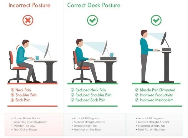 Set up your workspace – use an ergonomic chair with the screen at the right height so you’re not setting yourself up to fail! The 90/90/90 rule is a basic one to follow (see picture for details)